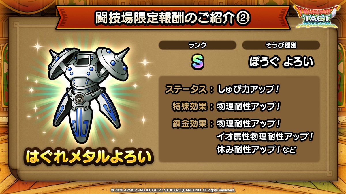 ドラクエタクトの「【朗報】物理パ終了!?闘技場限定報酬Sランクぼうぐ「はぐれメタルよろい」キタ━━━━(゚∀゚)━━━━!!」に関するまとめ記事です。